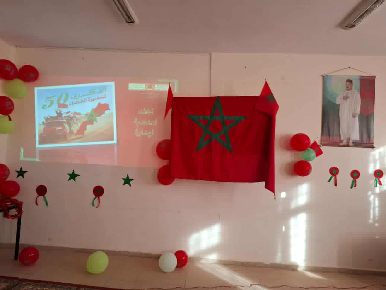 رحب فيها بكافة التلاميذ والتلميذات والأطر الإدارية والتربوية بهذه المناسبة الوطنية العزيزة على قلوب المغاربة والتي تعتبر ملحمة تاريخية يقول السيد المدير والتي جسدت عبقرية المغفور له الحسن الثاني طيب الله ثراه وإجماع الشعب المغربي حول قضية وحدته الترابية وكما تقدم بالشكر الجزيل للأستاذة الفاضلة نسرين شكري المشرفة على هذا الحفل المتميز بجانب زميلاتها الأستاذات الكريمات، ولكل من ساهم في هذا النشاط ، وبعدها تم فسح المجال أمام التلاميذ والتلميذات لتقديم فقرات الحفل في جو مفعم بالفرح والبهجة.