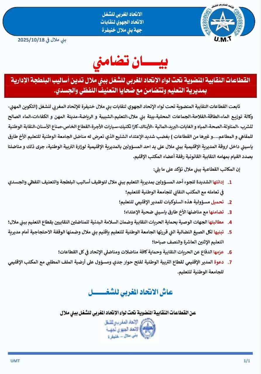 أصدرت القطاعات النقابية المنضوية تحت لواء الاتحاد المغربي للشغل بجهة بني ملال خنيفرة بيانًا تضامنيًا شديد اللهجة، استنكرت من خلاله ما وصفته بـ“أساليب السلطوية الإدارية” التي تمارسها مديرية التعليم ببني ملال، معلنة تضامنها المطلق مع ضحايا العنف اللفظي والجسدي داخل الوسط المهني.