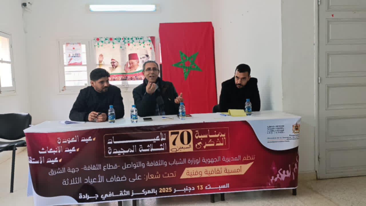 تحت شعار: “على ضفاف الأعياد الثلاثة”، نظمت المديرية الجهوية للثقافة بجهة الشرق، مساء يوم السبت 13 دجنبر 2025، بالمركز الثقافي وسط مدينة جرادة، نشاطا ثقافيا وفنيا متميزا، عرف قراءة وتقديم رواية “فدان الجمل” للمبدع الراقي ذ. عبد الرحيم كلموني، بحضور ممثل المديرية الجهوية للثقافة الدكتور ميمون راكب ومجموعة من المبدعين قدموا من وجدة وبركان وأحفير، إلى جانب مبدعي مدينة جرادة المكافحة، وعدد من المثقفين وعشاق فن السرد.