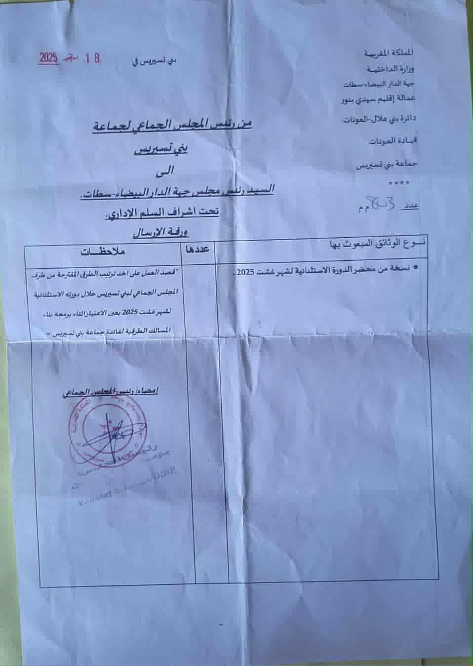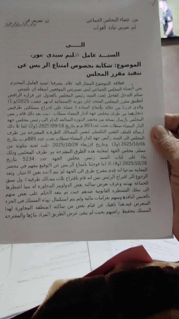 غير أن المفاجأة الكبرى – كما ورد في المراسلات الرسمية – كانت في رفض الرئيس التوقيع على محضر المعاينة الميدانية مع اللجنة الجهوية يوم 29 أكتوبر 2025، بدعوى أن المسالك المقترحة من طرفه لم تؤخذ بعين الاعتبار، رغم أن هذه الأخيرة لم تكن ضمن مقررات المجلس ولم تحظَ بأي تصويت أو مصادقة قانونية.