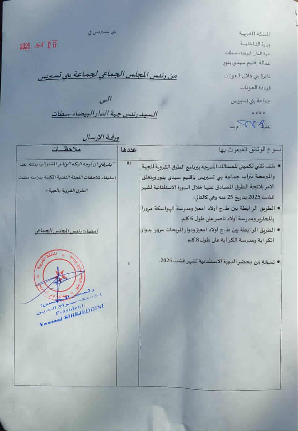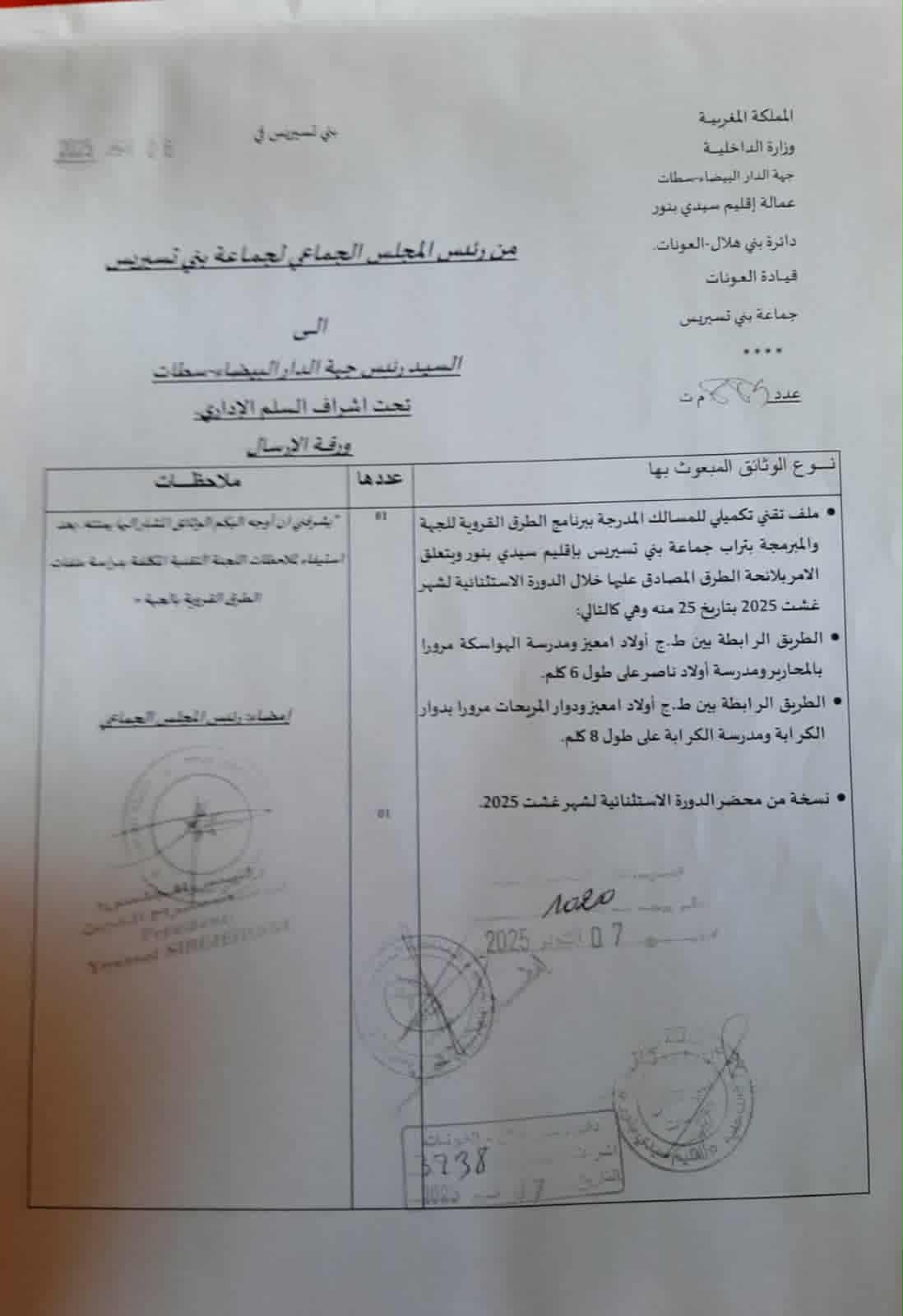 بحسب الشكاية التي وجهها أعضاء المجلس الجماعي إلى السيد عامل إقليم سيدي بنور، فإن المجلس صادق بالإجماع خلال دورته الاستثنائية على اقتراح مسلكين طرقيين ليتم إنجازهما في إطار برنامج الطرق القروية لجهة الدار البيضاء – سطات، بعدما تم إعداد الدراسات التقنية والمصادقة على الملف من طرف الجهات المختصة.