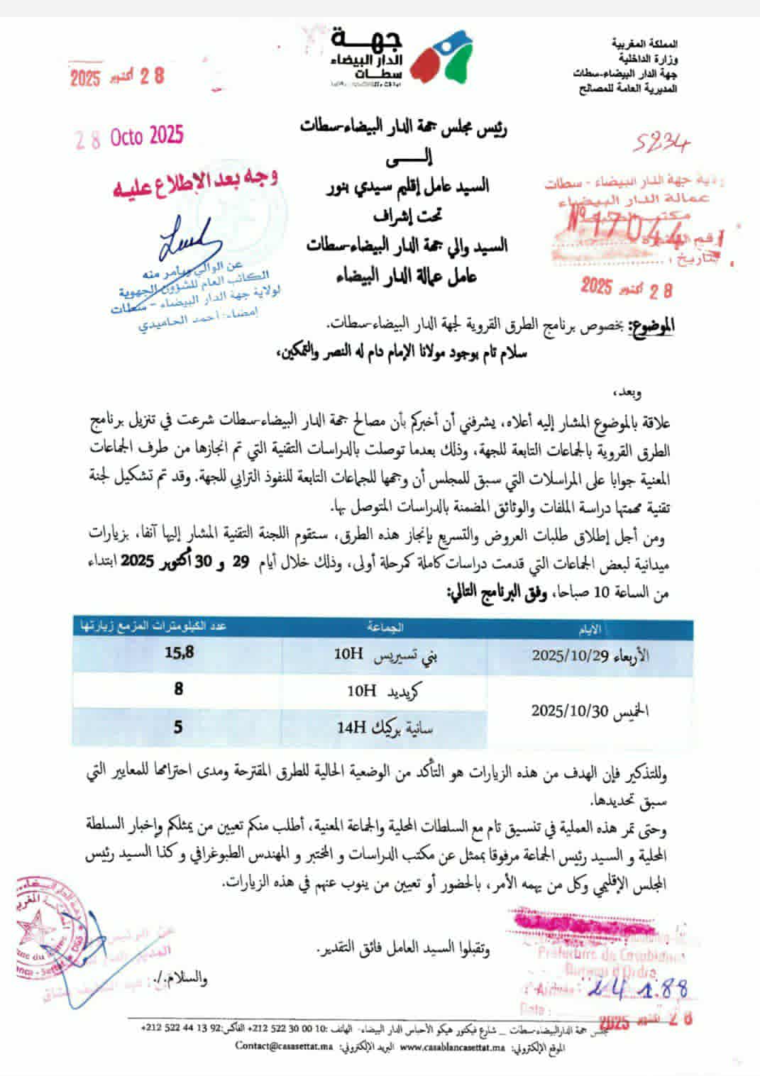 كما تفيد المراسلات أن أحد المسالك التي يقترحها الرئيس سبق أن تم تهيئته جزئياً، لكنه عرف نزاعات قضائية وتحفيظاً للعقارات على جنباته مما جعل عرضه لا يتجاوز 5 أمتار فقط، وهو ما يجعل إنجازه غير قابل للتطبيق تقنياً وقانونياً، حسب تعبير الأعضاء الموقعين على الشكاية. في المقابل، أبان مجلس جهة الدار البيضاء – سطات عن تجاوب سريع وجدي، حيث وجه مراسلة رسمية (عدد 5234 بتاريخ 28 أكتوبر 2025) إلى عامل الإقليم، معلناً عن إطلاق الزيارات الميدانية للجماعات التي أتمت ملفاتها التقنية قصد برمجة المشاريع. لكن عوض أن يواكب الرئيس هذا المسار التنموي، اختار – حسب الشكاية – الانسحاب وعرقلة العملية بتبريرات واهية، مما يهدد بتعطيل مشروع استراتيجي ينتظره آلاف المواطنين في العالم القروي.