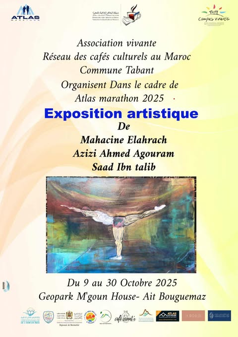 وفي إطار أطلس ماراطون 2025 تنظم الجمعية الحية وشبكة المقاهي الثقافية وجماعة تبانت بإقليم أزيلال وعدة شركاء ، معرضا فنيا للفنانين التشكيليين ، محاسن الأطرش وعزيزي أحمد أكورام وسعد إبن طالب في الفترة من 9 إلى 3 أكتوبر 2025 بدار جيوبارك مكون بأيت بوكماز.