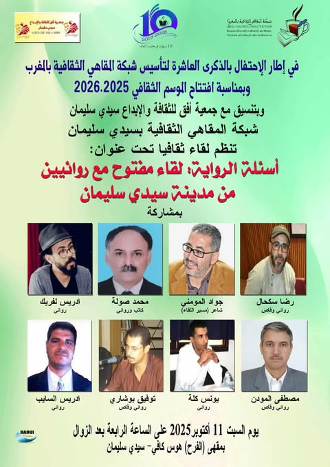 وبمناسبة إفتتاح الموسم الثقافي 2025/2026 ، وبتنسيق مع جمعية أفق للثقافة والإبداع بسيدي سليمان ، تفتتح شبكة المقاهي الثقافية تجربتها الأولى بالمدينة بلقاء ثقافي تحت عنوان “أسئلة الرواية” لقاء مفتوح مع روائيين من مدينة سيدي سليمان ، بمشاركة الروائيين رضا سكحال وجواد المومني ومحمد صولة وادريس لفريك ومصطفى المودن ويونس كلة و توفيق بوشاري وادريس السايب ، وذلك يوم السبت11 أكتوبر 2025 على الساعة الرابعة بعد الزوال بمقهى ( الفرح ) هوس كافي بمدينة سيدي سليمان.
