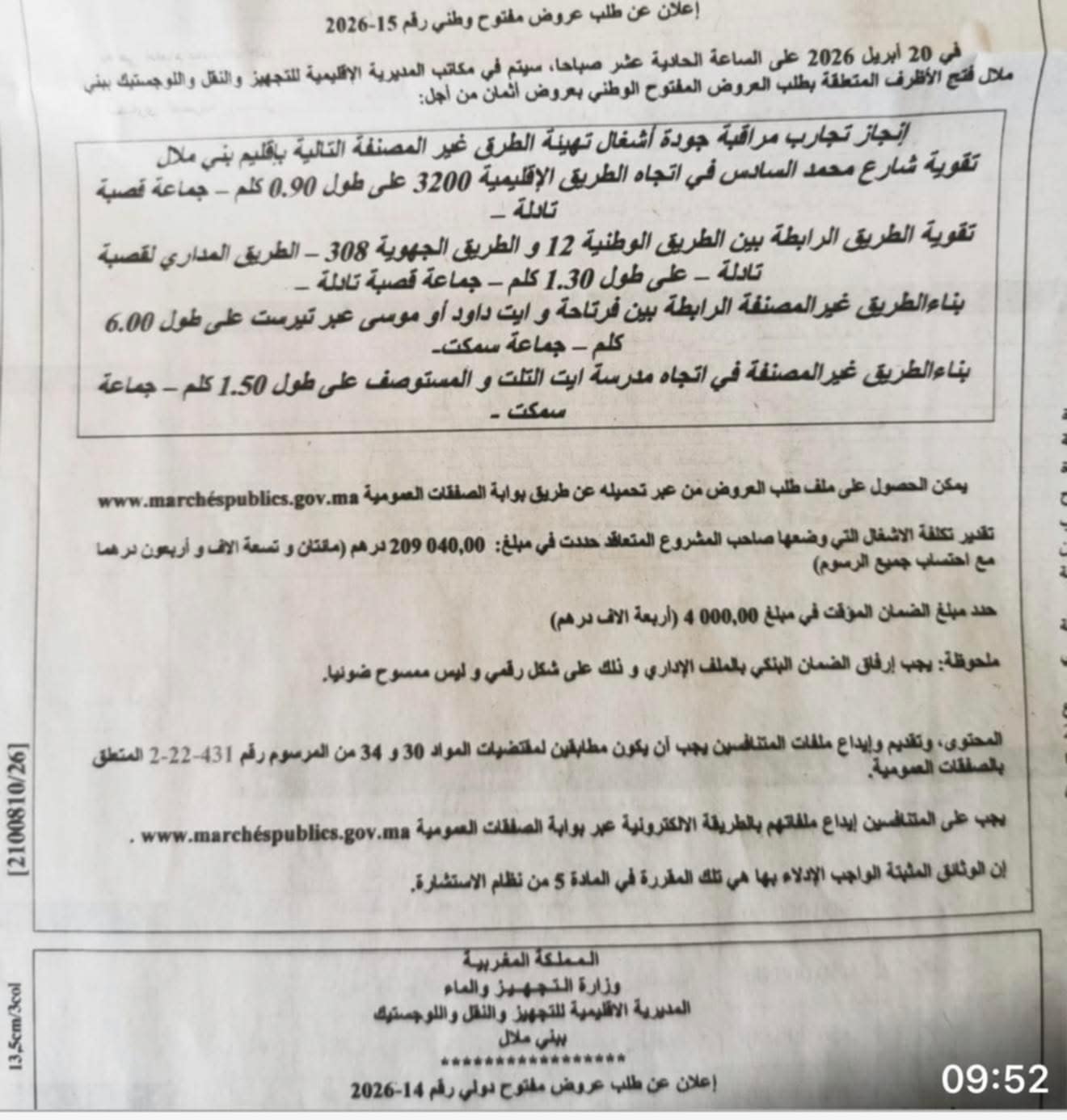 وتبلغ الكلفة التقديرية لهذا المشروع 209 آلاف و40 درهما مع احتساب الرسوم، فيما حدد مبلغ الضمان المؤقت في 4 آلاف درهم، على أن يتم فتح الأظرفة الخاصة بطلب العروض يوم 20 أبريل 2026.
