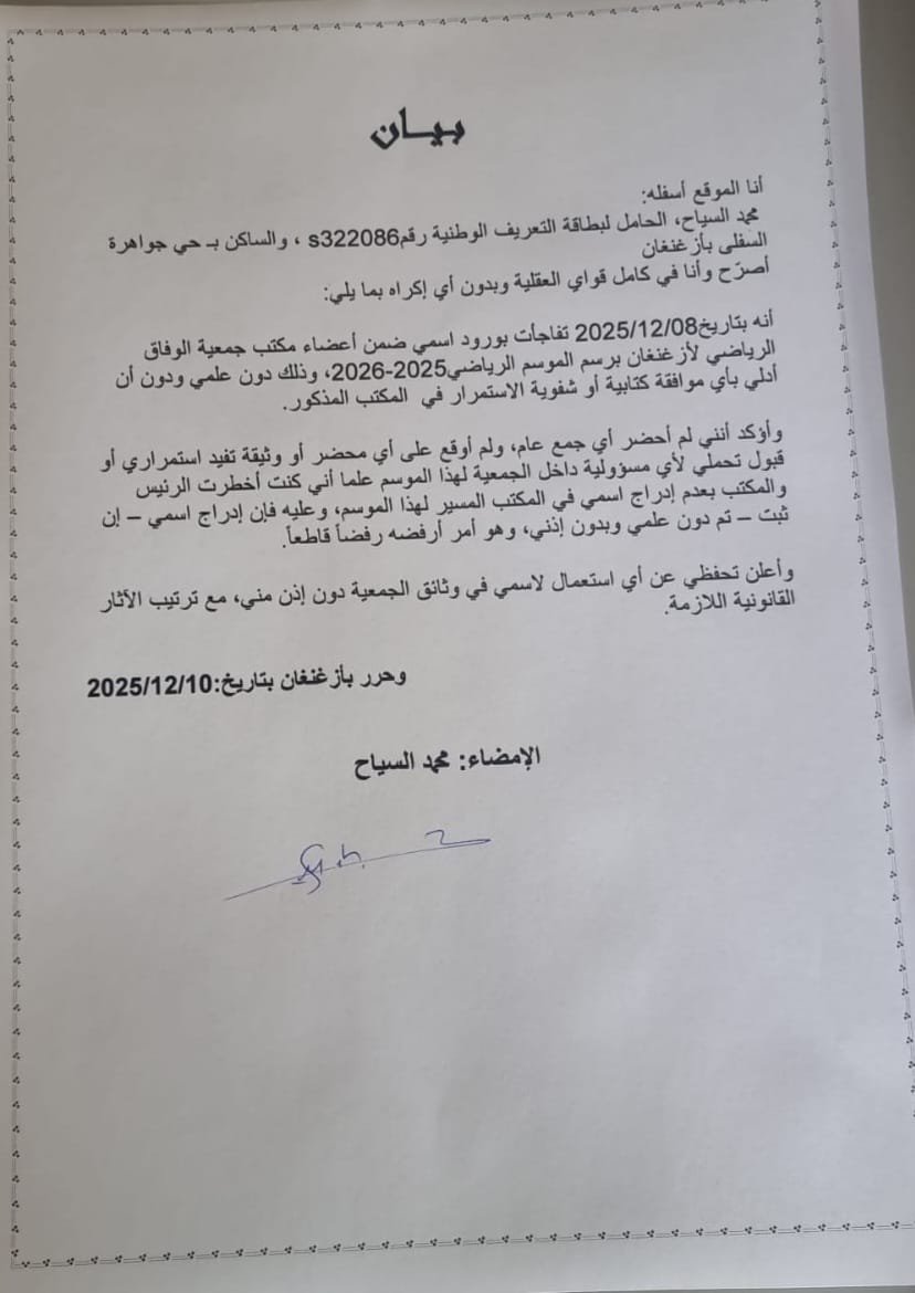 تحقيق خاص لم يكن يتوقع المواطن محمد السياح أن يجد اسمه ضمن لائحة المكتب المسير لجمعية الوفاق الرياضي لأزغنغان للموسم 2025-2026.