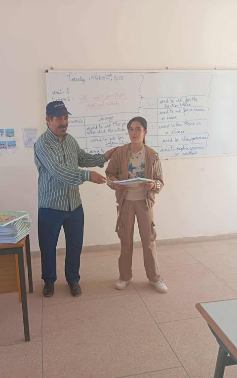 تحت إشراف الإدارة التربوية للثانوية الإعدادية لهدارة والأستاذة النشيطة فاطمة وراوي أستاذة اللغة الإنجليزية تم يوم الثلاثاء 7 أكتوبر2025 على الساعة الثانية والنصف مساء توزيع مجموعة من الكتب المدرسية الخاصة بمادة الإنجليزية على تلاميذ المستوى الثالثة إعدادي ، في أجواء مليئة بالفرح والبهجة .