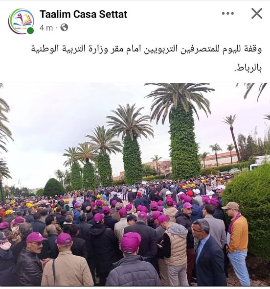 كما طالب المتصرفون التربويون بإنصاف المتضررين من الترقيات المتعلقة بسنوات 2021 و2022 و2023، والاستجابة لباقي مطالبهم التي يعتبرونها أساسية لإرساء العدالة المهنية داخل المنظومة التربوية.
