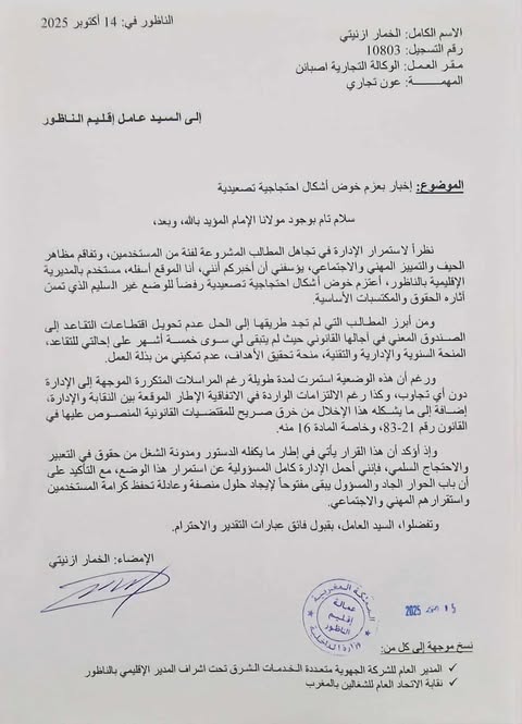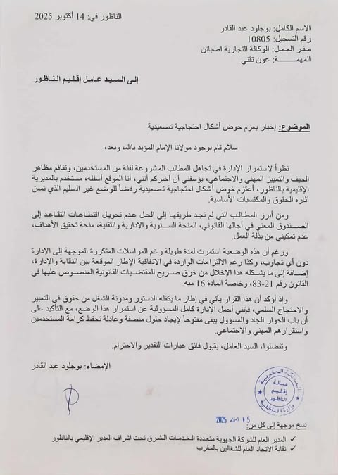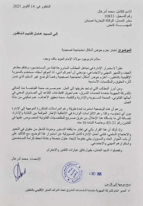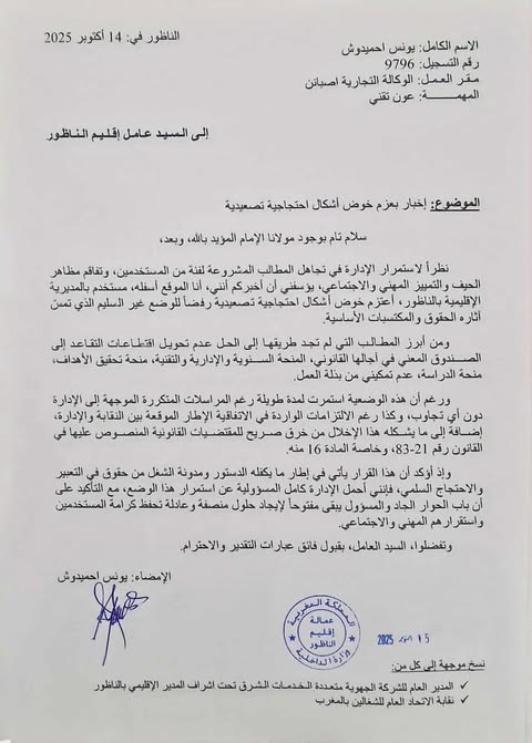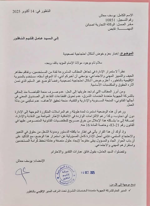 وشدد عديوي على أن خطوته تأتي “في إطار ما يكفله الدستور ومدونة الشغل من حقوق في التعبير والاحتجاج السلمي”، محمّلاً إدارة الشركة المسؤولية الكاملة عن تداعيات استمرار الوضع الحالي، ومؤكداً أن باب الحوار الجاد والمسؤول ما يزال مفتوحاً من أجل إيجاد حلول منصفة وعادلة تحفظ كرامة المستخدمين واستقرارهم المهني والاجتماعي.
