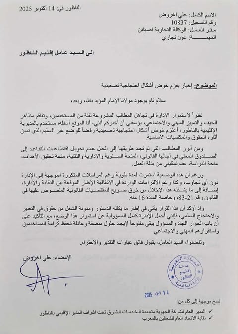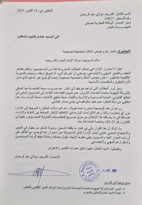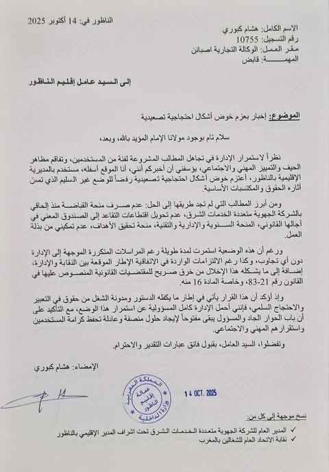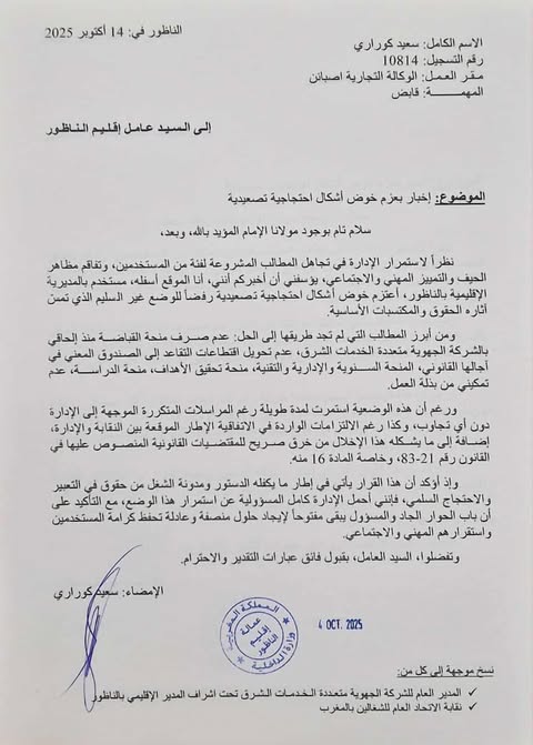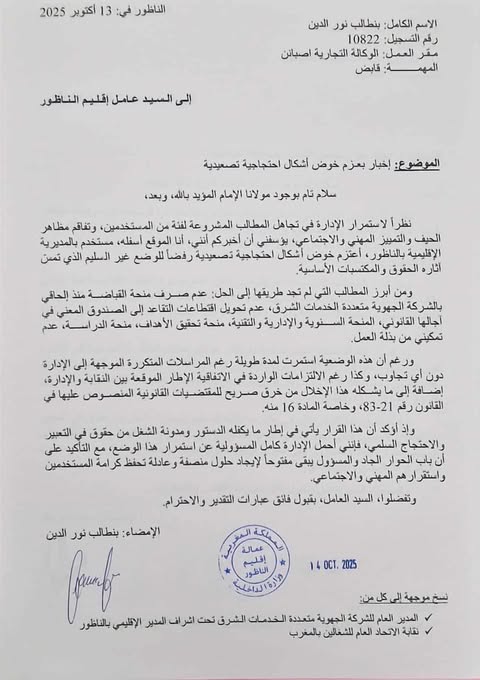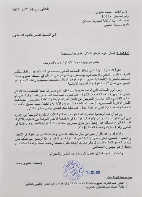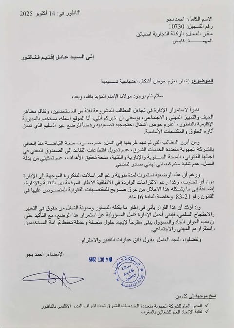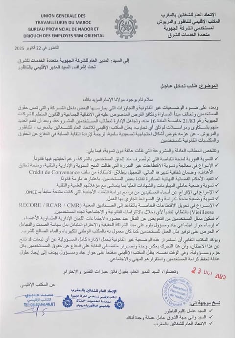 وقد تم توجيه نسخ من هذه المراسلات إلى كل من المدير العام للشركة الجهوية متعددة الخدمات الشرق، تحت إشراف المدير الإقليمي بالناظور، ونقابة الاتحاد العام للشغالين بالمغرب، في انتظار التفاعل الرسمي مع الملف الذي بات يؤرق عدداً من المستخدمين داخل الشركة.