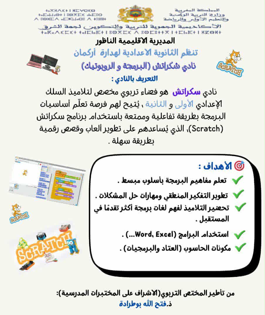 المكان:تنظم الثانوية الاعدادبة لهدارة ايام : 27 / 28 / 29 أكتوبر 2025 الفئة المستهدفة: تلاميذ السنة الأولى والثانية إعدادي الحدث: تنظيم حصص تربوية في إطار نادي السكراتش، بهدف إدماج التلاميذ في عالم البرمجة وتنمية مهاراتهم الرقمية والإبداعية.