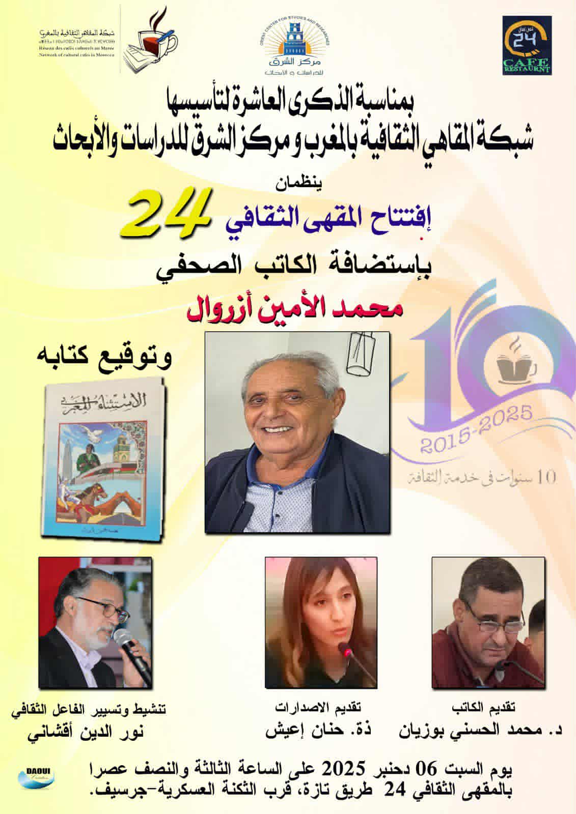 وبتنسيق مع مركز الشرق للدراسات والأبحاث ، تنظم الشبكة ، المقهى الثقافي الأول بإستضافة الكاتب الصحفي محمد الأمين أزروال في حفل توقيع كتابه ” الإستثناء المغربي ” بمقهى 24 ،طريق تازة قرب الثكنة العسكرية بجرسيف على الساعة الثالثة والنصف عصرا .