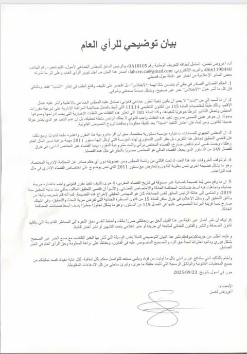 - الحكم القضائي الصادر في حقي لم يتضمن بتاتًا تهمة “الاختلاس”، بل اقتصر على تكييف وقائع الملف في إطار “التبديد” فقط. وبالتالي فإن كل ما نُشر حول “الاختلاس” خبر غير صحيح، ويشكل مساسًا بسمعتي وشرفي.