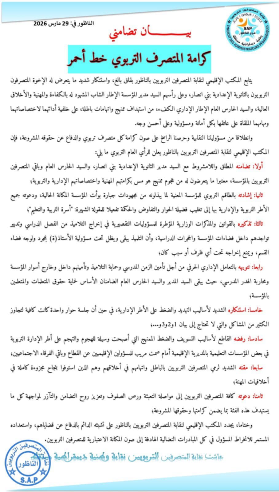 مضيفا في بيانه بأن المكتب النقابي يعلن تضامنه المطلق واللامشروط مع مدير إحدى المؤسسات التعليمية والحارس العام على خلفية ما يتعرضان له من استهداف ممنهج و اتهامات باطلة مع مضايقات تمس بسمعتهما المهنية كأطر تربوية يشهد الجميع بنزاهتهم واستقامتهم ..