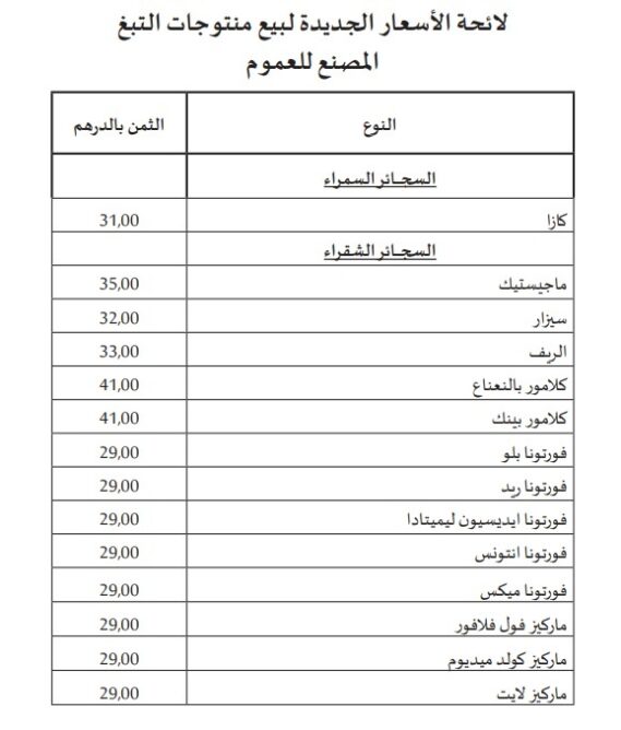 كما عرفت الأصناف المتميزة مثل “كالمور” تحديد سعرها في 41 درهما، في حين تراوحت أسعار علامة “فورتونا” بمختلف أنواعها صعودا لتشمل النسخ الخاصة والمحدودة، مما يعكس استراتيجية جديدة في تنويع العرض السعري حسب فئات المنتجات.