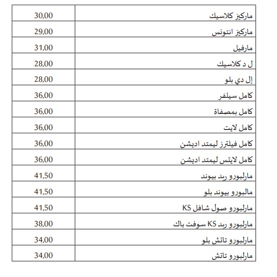 وفي ذات السياق، شهدت العلامات الدولية الكبرى تغييرات ملحوظة، حيث تذبذبت أسعار “ماركيز” بين 29 و36 درهما حسب النوع، فيما سجلت منتجات “مارلبورو” مستويات تراوحت ما بين 29 و41,50 درهما تبعا لنوعية التعبئة.