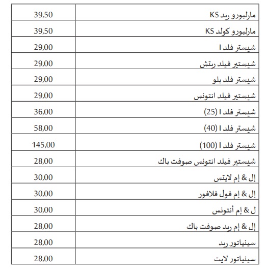 كما عرفت الأصناف المتميزة مثل “كالمور” تحديد سعرها في 41 درهما، في حين تراوحت أسعار علامة “فورتونا” بمختلف أنواعها صعودا لتشمل النسخ الخاصة والمحدودة، مما يعكس استراتيجية جديدة في تنويع العرض السعري حسب فئات المنتجات.